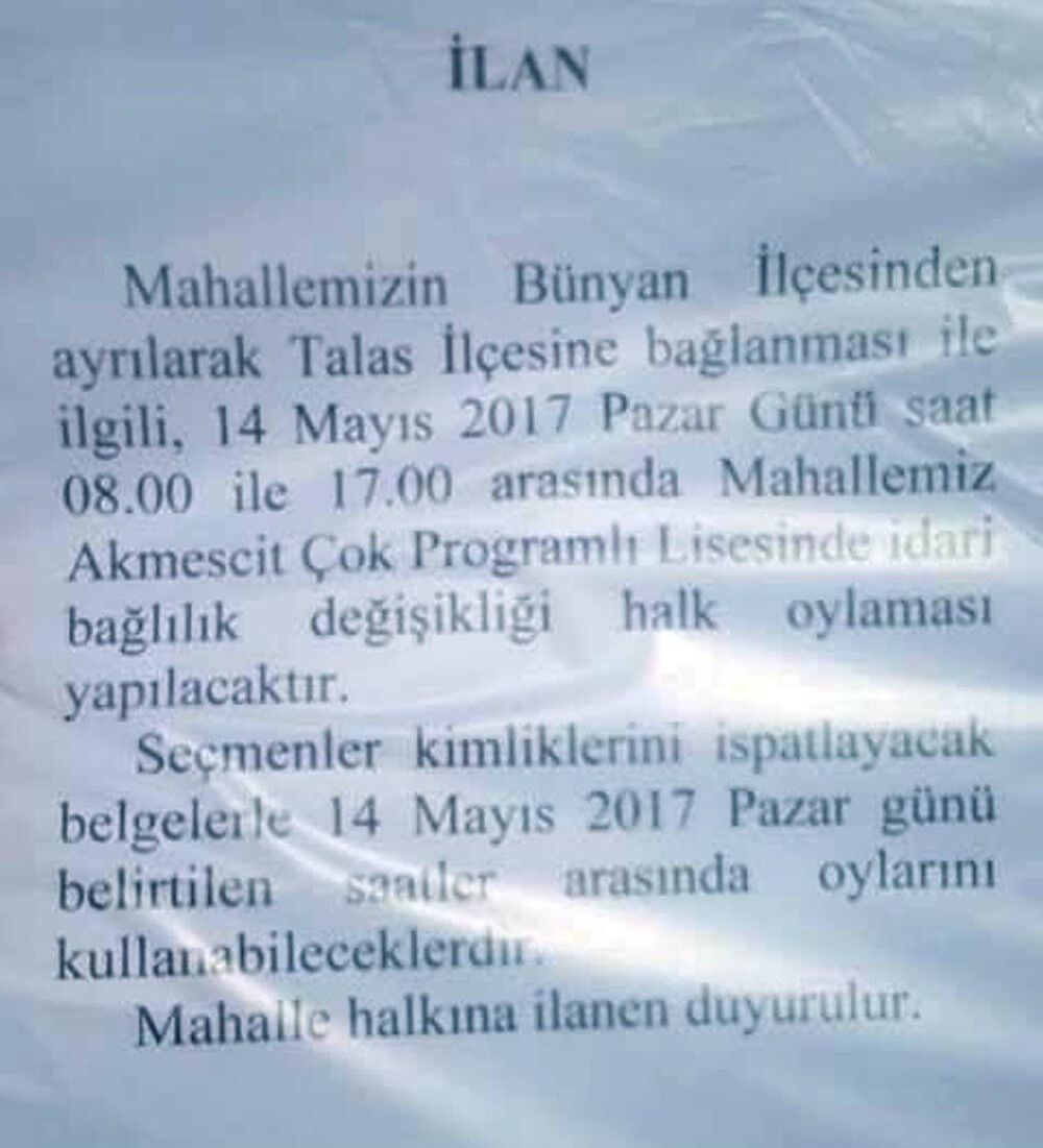 “Mahallemizin Bünyan ilçesinden ayrılarak Talas ilçesine bağlanması ile ilgili, 14 Mayıs 2017 Pazar günü saat 08.00 ile 17.00 arasında mahallemiz Akmescit Çok Programlı Lisesinde idari bağlılık değişikliği halk oylaması yapılacaktır. Seçmenler kimliklerini ispatlayacak belgelerle 14 Mayıs 2017 Pazar günü belirtilen saatler arasında oylarını kullanabileceklerdir. Mahalle halkına ilanen duyurulur.”