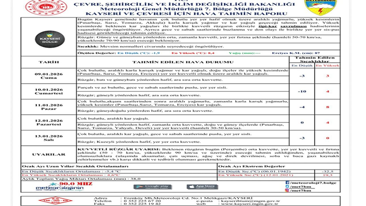 Meteoroloji Genel Müdürlüğü 7’nci Bölge Müdürlüğü’nün yayımladığı hava tahmin raporuna göre, Kayseri genelinde önümüzdeki günlerde çok bulutlu ve aralıklı yağışlı hava etkili olacak. Yağışların özellikle yüksek kesimlerde karla karışık yağmur ve kar şeklinde görüleceği, Pınarbaşı, Sarız, Tomarza, Akkışla ve Erciyes çevresinde zaman zaman kuvvetleneceği bildirildi.