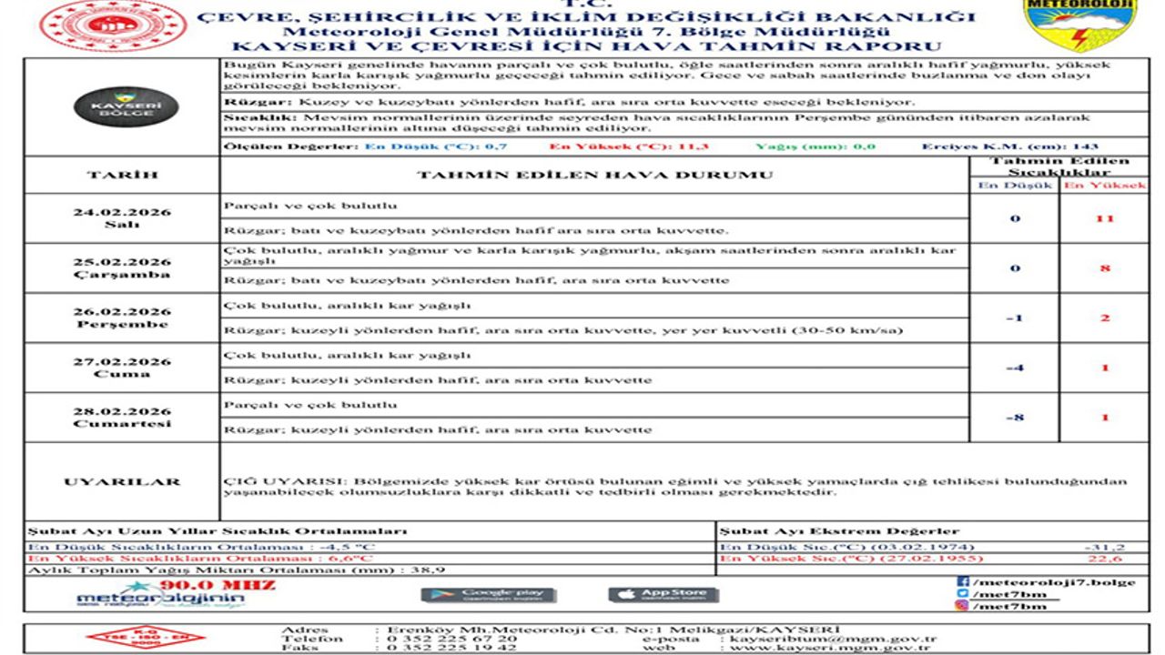 Meteoroloji 7. Bölge Müdürlüğü tarafından yayımlanan hava tahmin raporuna göre, Kayseri ve çevresinde hafta boyunca kar yağışı ve soğuk hava etkili olacak.