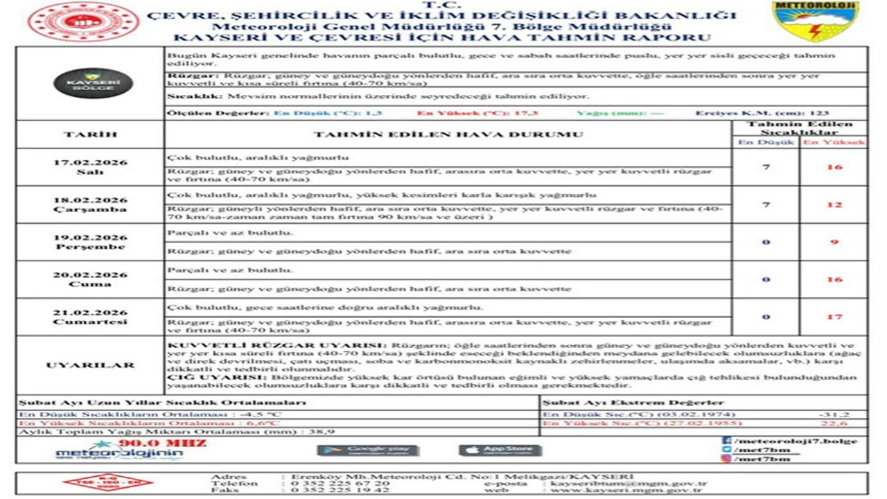 Meteoroloji 7. Bölge Müdürlüğü tarafından yayımlanan hava tahmin raporuna göre, Kayseri’de hafta boyunca yağış ve kuvvetli rüzgar etkili olacak.