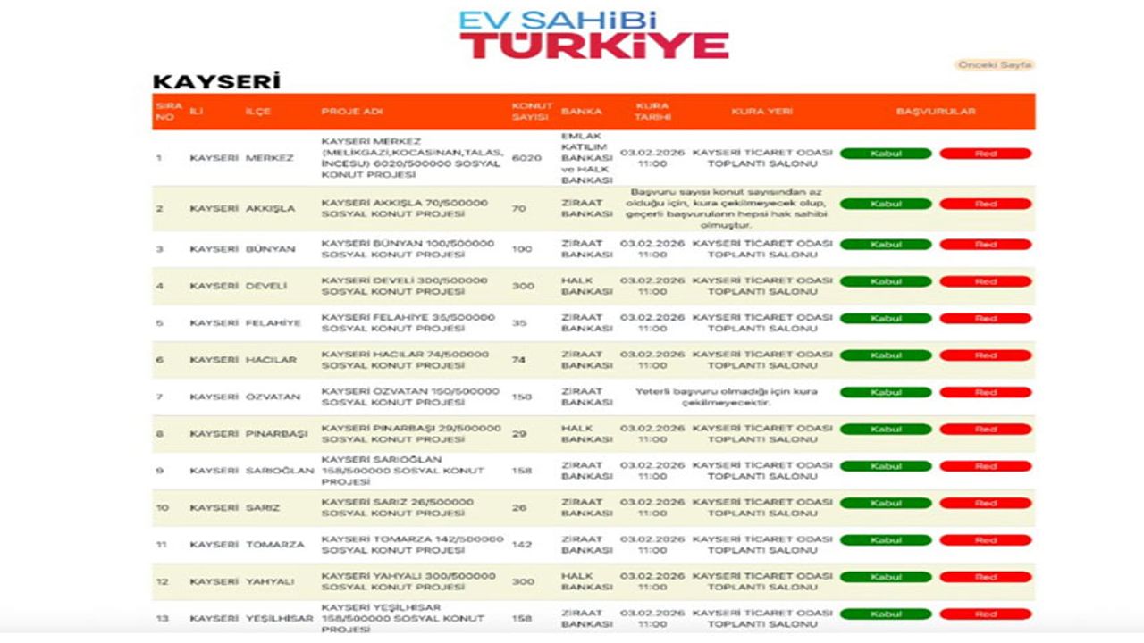 Yüzyılın Konut Projesi kapsamında Kayseri’de 7 bin 562 konut için kura çekilişi 3 Şubat'ta Kayseri Ticaret Odası Toplantı Salonu'nda saat 11:00'de yapılacak.