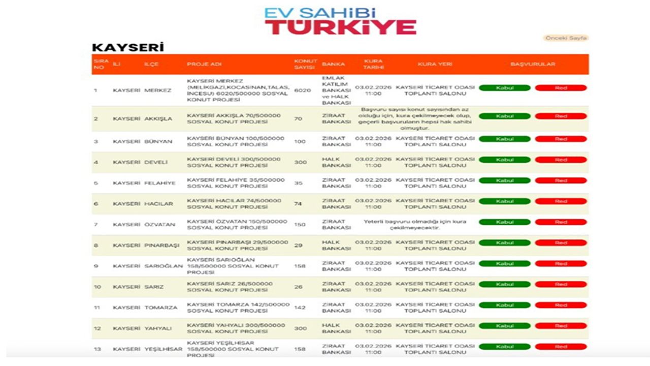Yüzyılın Konut Projesi; 500 bin sosyal konut kapsamında Kayseri’ye 7 bin 562 konut inşa edilecek. TOKİ çekiliş sonrası sonuçlar e-Devlet ve TOKİ'nin kendi sayfası üzerinden yayınlanacak. Kayseri için kura çekiliş tarihi 3 Şubat olarak açıklandı. Kura, bugün Kayseri Ticaret Odası Toplantı Salonu'nda saat 11:00'de yapılacak.