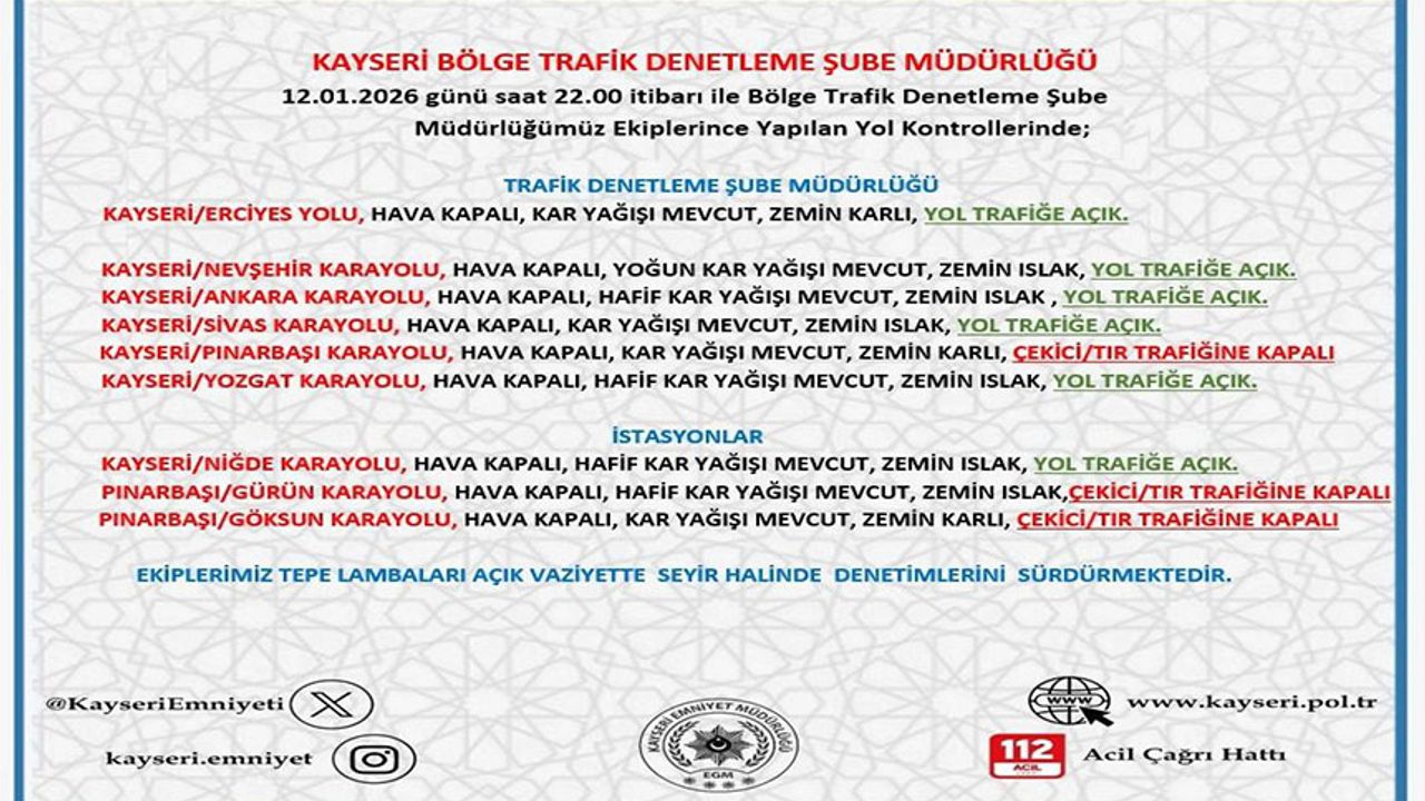 Kayseri İl Emniyet Müdürlüğü Bölge Trafik Denetleme Şube Müdürlüğü ekiplerince yol kontrolleri gerçekleştiriliyor. Bu kapsamda kontroller sonucunda merkez ve çevre ilçelerde bazı yolların açık bazı yolların ise çekici/tır trafiğine kapalı olduğu bildirildi.