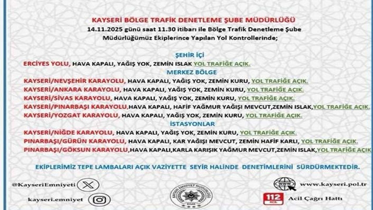 Kayseri İl Emniyet Müdürlüğü ekiplerince yol durumu hakkında bilgilendirme yapıldı ve Kayseri geneli yolların trafiğe açık olduğu bildirildi. Kayseri’de kar yağışı etkisini gösterirken merkezde de kar yağışı hakim oldu. Kar yağışı sebebiyle ulaşımda aksamalar olmaması adına ekipler tarafından kontroller yapıldı. İl Emniyet Müdürlüğü Bölge Trafik Denetleme Şube Müdürlüğü ekipleri ise 14.11.2025 günü 11:30 saati itibarı ile yol durumları hakkında bilgilendirme yaptı.