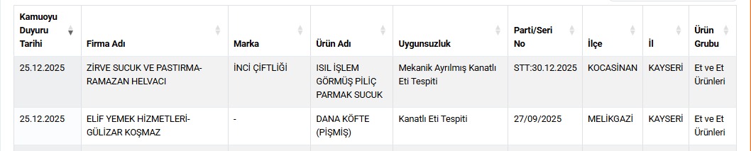 Ayrıca ‘Elif Yemek Hizmetleri-Gülizar Koşmaz’ firmasına ait ‘Dana Köfte (Pişmiş)’ ürününde ‘Kanatlı Eti Tespiti’ usulsüzlüğü belirlendi.