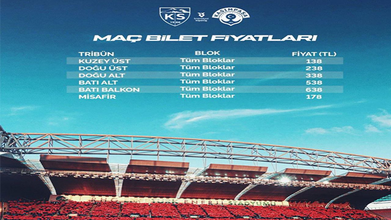 Kayserispor Süper Ligin 11’inci haftasında sahasında Kasımpaşa’yı konuk edecek. Pazar günü oynanacak olan müsabakanın biletleri satışa çıktı. Kayserispor’dan yapılan açıklamada, “Kayserisporumuzun Trendyol Süper Lig 2025-2026 Sezonu 11. haftasında 2 Kasım Pazar günü saat 17.00'de Kasımpaşa ile RHG Enertürk Enerji Stadyumu’nda oynayacağı karşılaşmanın biletleri Passo tarafından yarın saat 11.00'de satışa sunulacak” ifadelerine yer verildi.