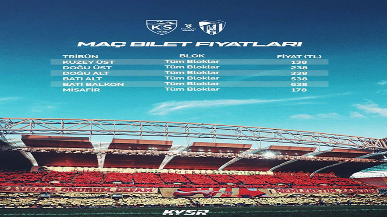 Kayserispor, Süper Ligin 21’nci haftasında evinde Kocaelispor’u konuk edecek. Bu maçın biletleri saat 11.00 itibariyle satışa çıktı. Kulüpten yapılan açıklamada,“Kayserisporumuzun Trendyol Süper Lig 2025-2026 Sezonu 21. haftasında 9 Şubat Pazartesi günü saat 17.00’de Kocaelispor ile RHG Enertürk Enerji Stadyumu’nda oynayacağı karşılaşmanın biletleri Passo tarafından yarın saat 11.00'de satışa sunulacak” ifadelerine yer verildi.