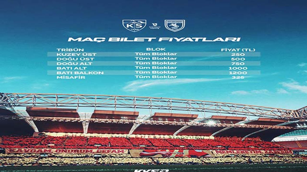 Kayserispor sezonun 9’uncu haftasında sahasında Samsunspor’u konuk edecek. 19 Ekim Pazar günü oynanacak olan maç bilet fiyatları belli oldu. Biletler saat 11.00 itibariyle satışa çıktı. Kayserispor’dan yapılan açıklamada, “Kayserisporumuzun Süper Lig 2025-2026 Sezonu 9. haftasında 19 Ekim Pazar günü saat 14.30'da Samsunspor ile RHG Enertürk Enerji Stadyumu’nda oynayacağı karşılaşmanın biletleri Passo tarafından bugün saat 11.00'de satışa sunulacak” açıklamasında bulunuldu.