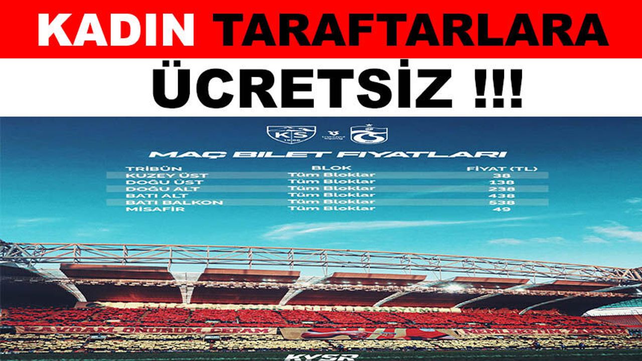 Kayserispor, Pazartesi günü Süper Ligin 25’inci haftasında Trabzonspor’u konuk edecek. Süper Lig’de çıktığı son 3 maçı kaybetmeyen Kayserispor, Pazartesi günü Trabzonspor’u konuk edecek. Saat 20.00’de başlayacak olan maçın biletleri satışa çıktı. Kulüpten yapılan açıklamada, “Kayserisporumuzun Süper Lig 2025-2026 Sezonu 25. haftasında 9 Mart Pazartesi günü saat 20.00’de Trabzonspor ile RHG Enertürk Enerji Stadyumu’nda oynayacağı karşılaşmanın biletleri Passo tarafından 4 mart Çarşamba saat 11.00'de satışa sunulacak. 8 Mart Dünya Kadınlar günü sebebi ile kuzey üst tribün biletleri kadın taraftarlarımız için ücretsizdir. Kadın taraftarlarımızın ücretsiz bilet alabilmesi için Kayserispor Passo Kartı olması gerekmektedir. Kadın tribün biletleri sadece Kayserispor Buluşma Noktasındaki Passo gişesinden ve maç günü stadyum gişelerinden alınabilecektir ve kadın tribün biletleri transfere kapalıdır” açıklamasına yer verildi.