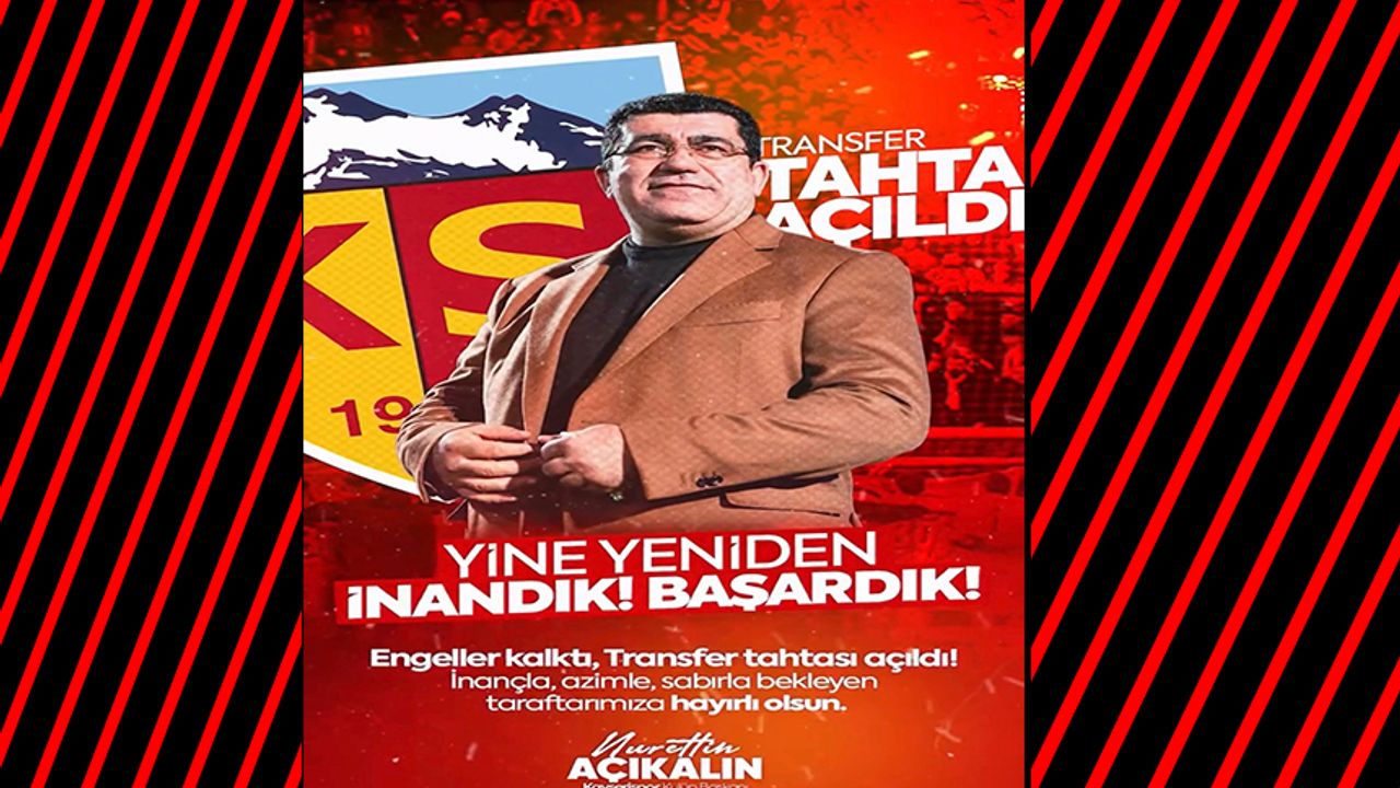 Kayserispor kulübünden yapılan açıklamada transfer tahtasının açıldığı açıklandı. Yapılan açıklamada, “Bazen bir şehir susar. Ama Kayseri asla vazgeçmez. Zor günlerden geçtik. Sabrettin, inandık. Mücadeleden hiç kopmadık. Ve bugün Kayserispor için yeni bir sayfanın kapılarını açıyoruz. Transfer tahtamız açılmıştır. Bilin ki açılan sadece bir tahta değil bu şehrin umududur. Kayserispor armasına ve taraftarına yakışır bir şekilde yeniden ayağa kalkacaktır. Bu forma için, bu şehir için bu büyük cami için biz buradayız. Yönetimimizle, teknik ekibimizle futbolcularımızla ve en önemlisi büyük Kayserispor taraftarıyla birlikte. Yine yeniden. İnandık, başardık” ifadelerine yer verildi.