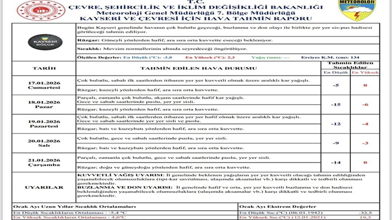 Meteoroloji 7. Bölge Müdürlüğü tarafından Kayseri’ye kuvvetli yağış, buzlanma ve don uyarısı yapıldı. Yapılan açıklamada, “Bugün Kayseri genelinde havanın çok bulutlu geçeceği, buzlanma ve don olayı ile birlikte yer yer sis-pus hadisesi görüleceği tahmin ediliyor. Yaşanabilecek olumsuzluklara (ulaşımda aksamalar vb.) karşı dikkatli ve tedbirli olunması gerekmektedir” denildi.
