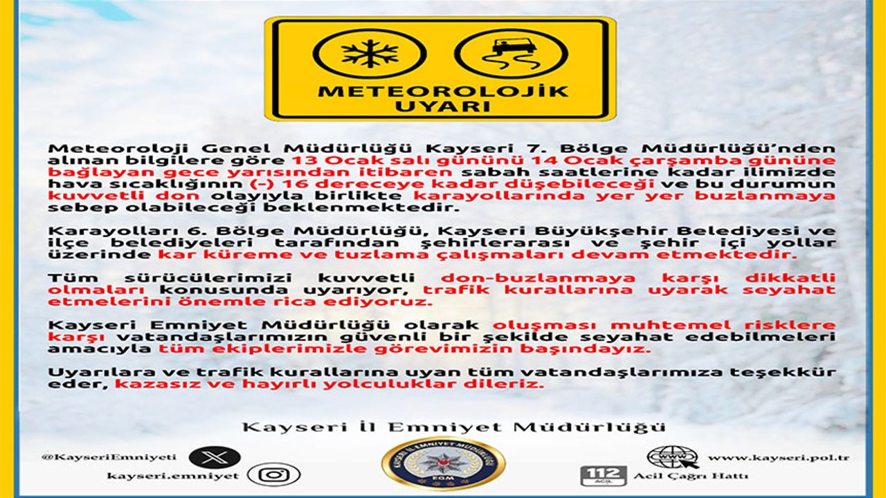 Meteoroloji Genel Müdürlüğü Kayseri 7. Bölge Müdürlüğü’nden alınan bilgilere göre 13 Ocak Salı gününü 14 Ocak Çarşamba gününe bağlayan gece yarısından itibaren sabah saatlerine kadar kentte hava sıcaklığının -16 dereceye kadar düşebileceği ve bu durumun kuvvetli don olayıyla birlikte karayollarında yer yer buzlanmaya sebep olabileceği bekleniyor.