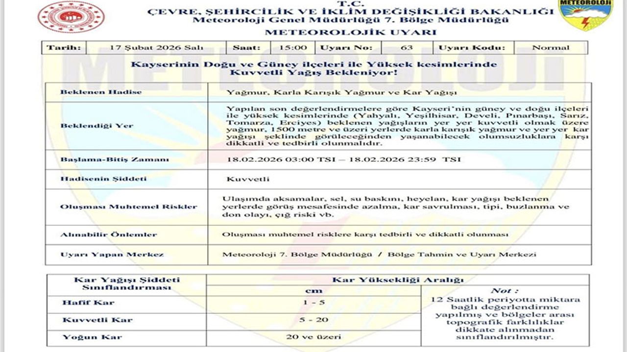 Meteoroloji 7. Bölge Müdürlüğü tarafından Kayseri’ye karla karışık yağmur ve kar yağışı uyarısı yapıldı. Bu kapsamda ulaşımda aksamalar, sel, su baskını, heyelan, kar yağışı beklenen yerlerde görüş mesafesinde azalma, kar savrulması, tipi, buzlanma ve don olayı, çığ riskine karşı vatandaşlara uyarılarda bulunuldu.
