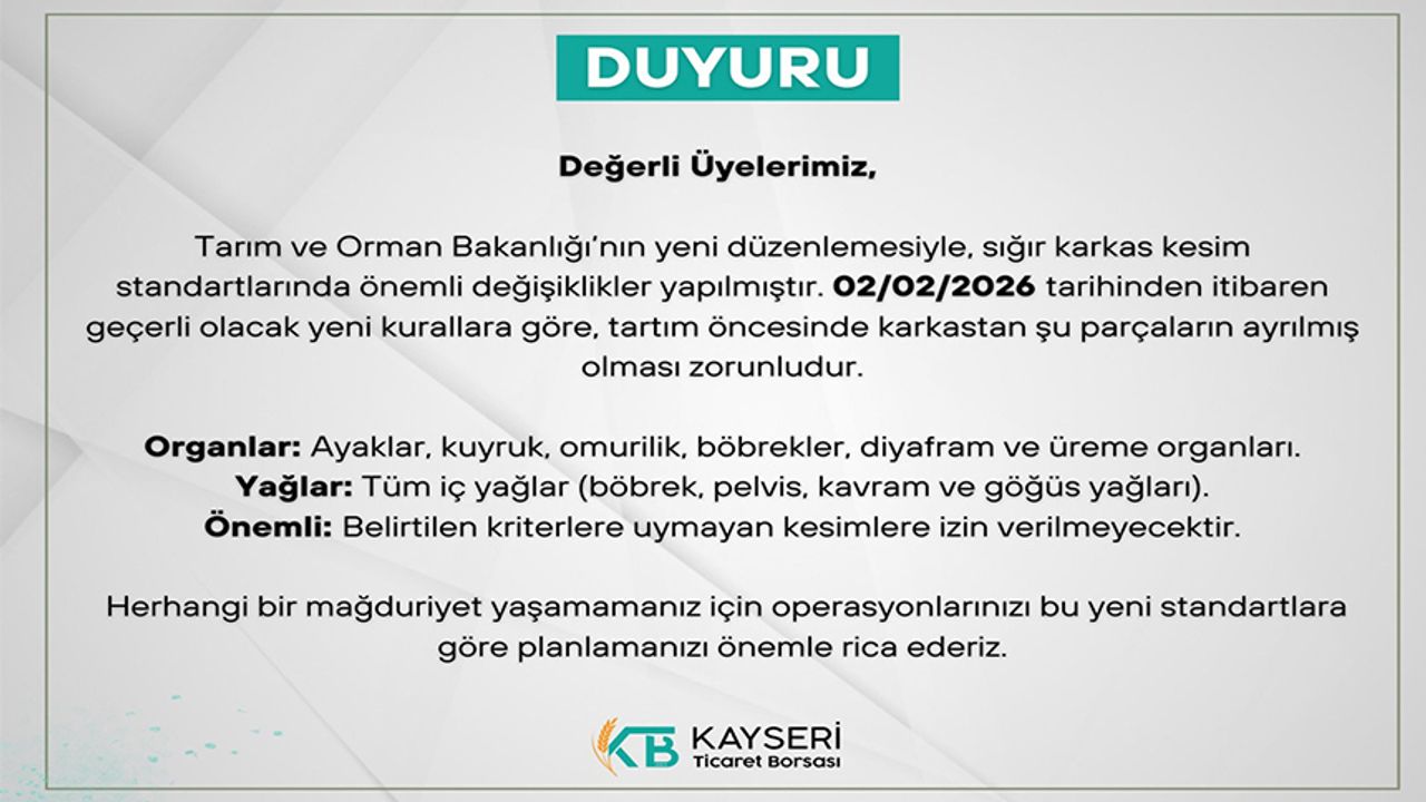 Kayseri Ticaret Borsası (KTB) yaptığı duyuruda Tarım ve Orman Bakanlığı’nın yeni düzenlemesiyle sığır karkas kesim standartlarında önemli değişiklikler yapıldığı bildirildi. Yapılan açıklamada, “Değerli Üyelerimiz, Tarım ve Orman Bakanlığı’nın yeni düzenlemesiyle, sığır karkas kesim standartlarında önemli değişiklikler yapılmıştır. 02/02/2026 tarihinden itibaren geçerli olacak yeni kurallara göre, tartım öncesinde karkastan şu parçaların ayrılmış olması zorunludur. Organlar: Ayaklar, kuyruk, omurilik, böbrekler, diyafram ve üreme organları. Yağlar: Tüm iç yağlar (böbrek, pelvis, kavram ve göğüs yağları). Önemli: Belirtilen kriterlere uymayan kesimlere izin verilmeyecektir. Herhangi bir mağduriyet yaşamamanız için operasyonlarınızı bu yeni standartlara göre planlamanızı önemle rica ederiz” denildi.