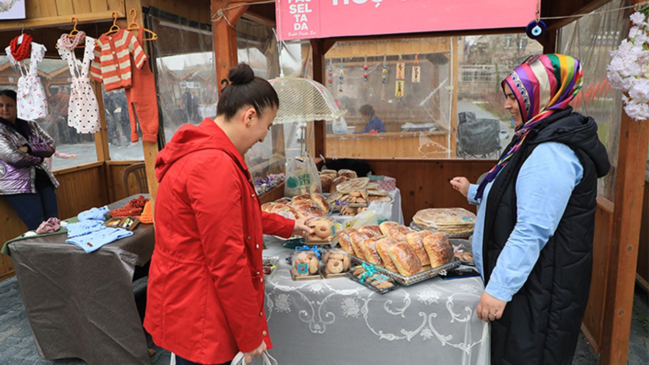 özenle hazırlanan ürünlerin yer aldığı pazarda; el işi tekstil ürünlerinden kışlık yiyeceklere, ev
