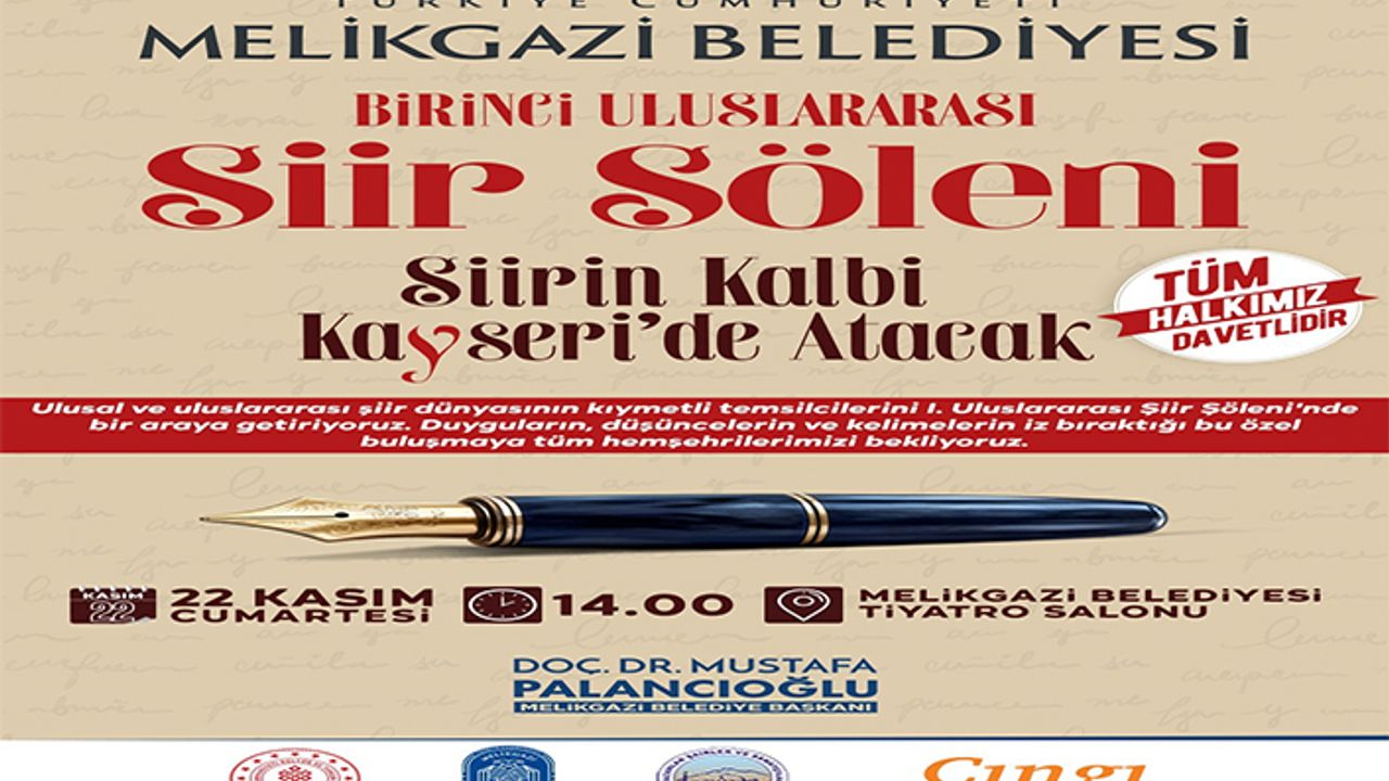Melikgazi Belediyesi tarafından 1. Uluslararası Şiir Şöleni düzenlenecek. Şölen 22 Kasım Cumartesi günü saat 14.00’da yapılacak.
