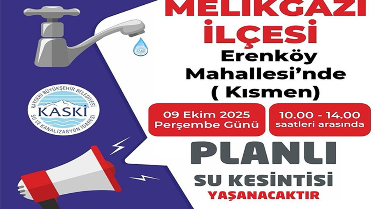 Kayseri Su ve Kanalizasyon İdaresi(KASKİ) tarafından planlı su kesintisi uyarısı yapıldı. Melikgazi ilçesi Erenköy Mahallesinde(kısmen) 9 Ekim 2025 Perşembe günü saat 10.00 ile 14.00 arasından planlı su kesintisi yapılacak. Su kesintisinin, içme suyu şebeke iyileştirme çalışması nedeniyle yapıldığı belirtildi.