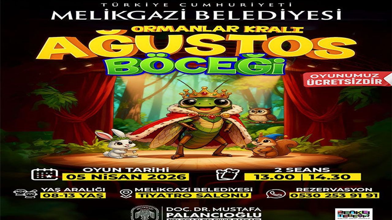 Melikgazi Belediyesi, çocukların kültürel ve sosyal gelişimine katkı sağlamak amacıyla düzenlediği etkinliklerine bir yenisini daha ekliyor. “Ormanlar Kralı Ağustos Böceği" tiyatro oyunu, 5 Nisan Pazar günü Melikgazi Belediyesi Tiyatro Salonu’nda minikler ile buluşacak.