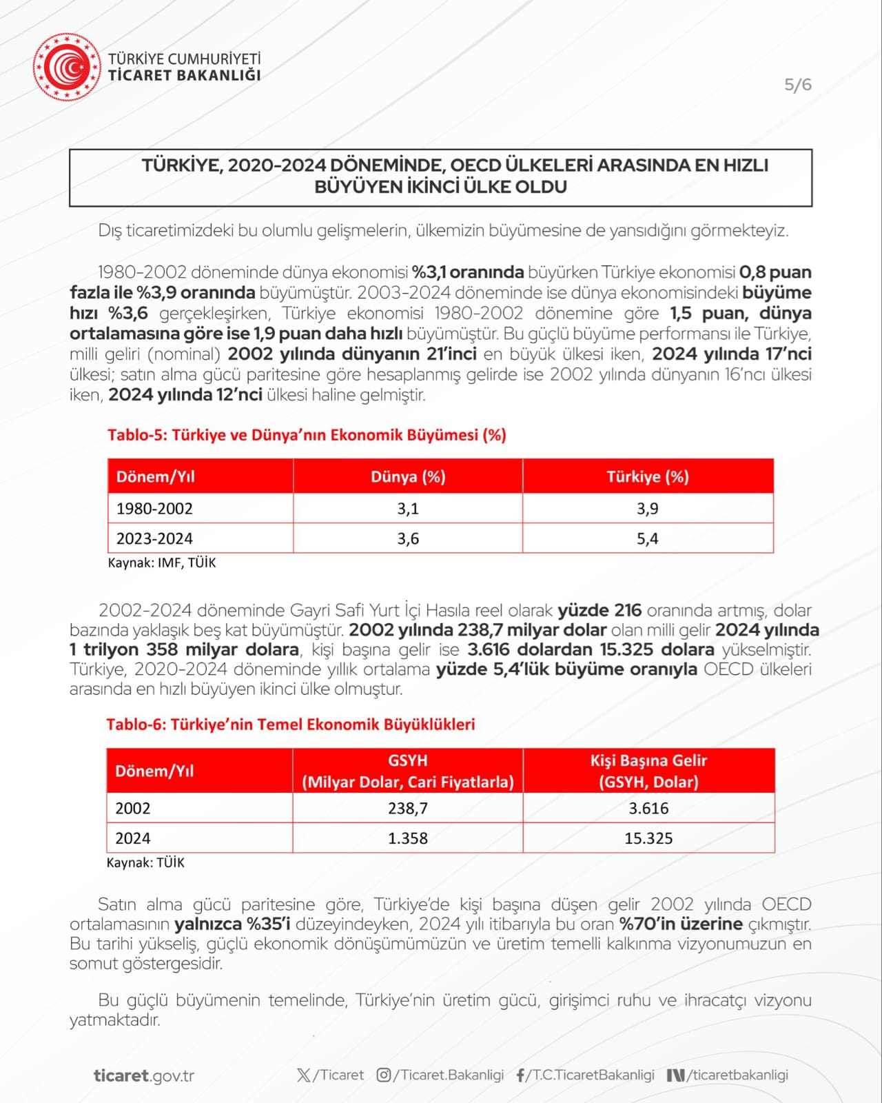 IMF ve TÜİK verilerine göre Türkiye, 2020 ile 2024 arası yıllık ortalama yüzde 5,4 büyümeyle OECD ülkeleri arasında en hızlı büyüyen ikinci ülke oldu.