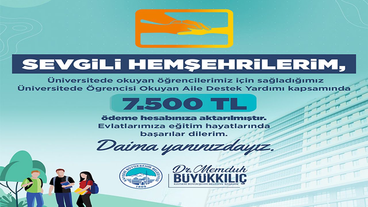 Bu kapsamda Başkan Büyükkılıç’ın sosyal belediyecilik anlayışı doğrultusunda hayata geçirilen “Üniversitede Öğrencisi Okuyan Aile Destek Yardımı” projesinde 2025-2026 eğitim öğretim yılı destek ödemeleri hesaplara yattı.