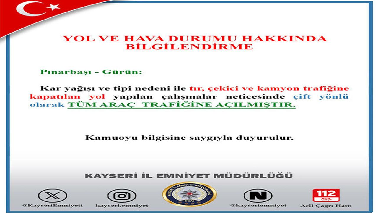 Kayseri İl Emniyet Müdürlüğü Trafik Denetleme Şube Müdürlüğü'nün hava ve yol durumu hakkında yapmış olduğu bilgilendirmelere göre; Kar yağışı ve tipi nedeniyle tır, çekici ve kamyon trafiğine kapatılan yol, yapılan çalışmalar neticesinde çift yönlü olarak tüm araç trafiğine açıldı.