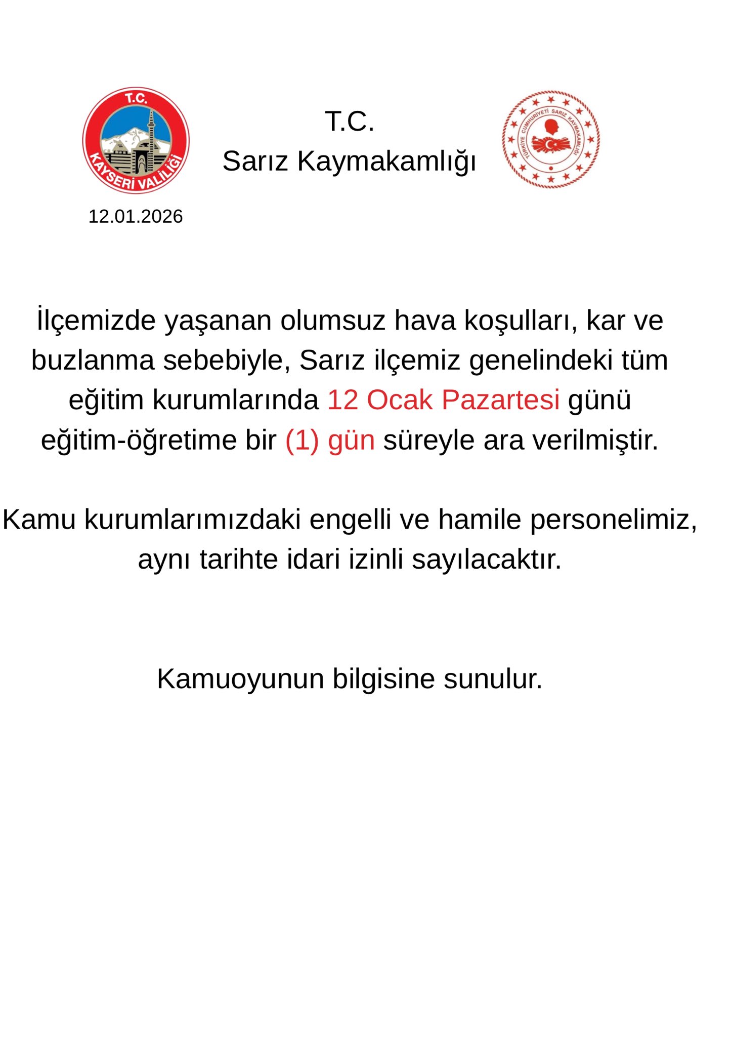 Pınarbaşı ve Sarız Kaymakamlıklarından yapılan yazılı açıklamada, olumsuz hava koşulları ve ulaşımda yaşanabilecek aksaklıklar nedeniyle ilçelerdeki tüm resmi ve özel eğitim kurumlarında eğitime yarın ara verildiği bildirildi. Kamu kurumlarında çalışan engelli ve hamile personelin ise 1 gün izinli sayılacağı açıklandı.