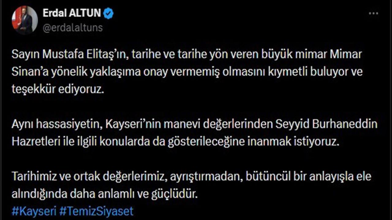 Kayseri Büyükşehir Belediye Meclisi tarafından gündeme alınan Kocasinan Bulvarı’na AK Parti Genel Başkan Vekili Mustafa Elitaş’ın isminin verilmesi önerisi kamuoyunda yankı uyandırmıştı. Meclis’te gündeme gelen ve farklı kesimlerde görüş ayrılıklarına neden olan teklif için, Elitaş’ın isteği üzerine geri adım atıldığı ifade edildi. Teklifin geri çekilmesi ile ilgili açıklamalarda bulunan Saadet Partisi Kayseri İl Başkanı Erdal Altun, “Sayın Mustafa Elitaş’ın, tarihe ve tarihe yön veren büyük mimar Mimar Sinan’a yönelik yaklaşıma onay vermemiş olmasını kıymetli buluyor ve teşekkür ediyoruz. Aynı hassasiyetin, Kayseri’nin manevi değerlerinden Seyyid Burhaneddin Hazretleri ile ilgili konularda da gösterileceğine inanmak istiyoruz. Tarihimiz ve ortak değerlerimiz, ayrıştırmadan, bütüncül bir anlayışla ele alındığında daha anlamlı ve güçlüdür” ifadelerinde bulundu.