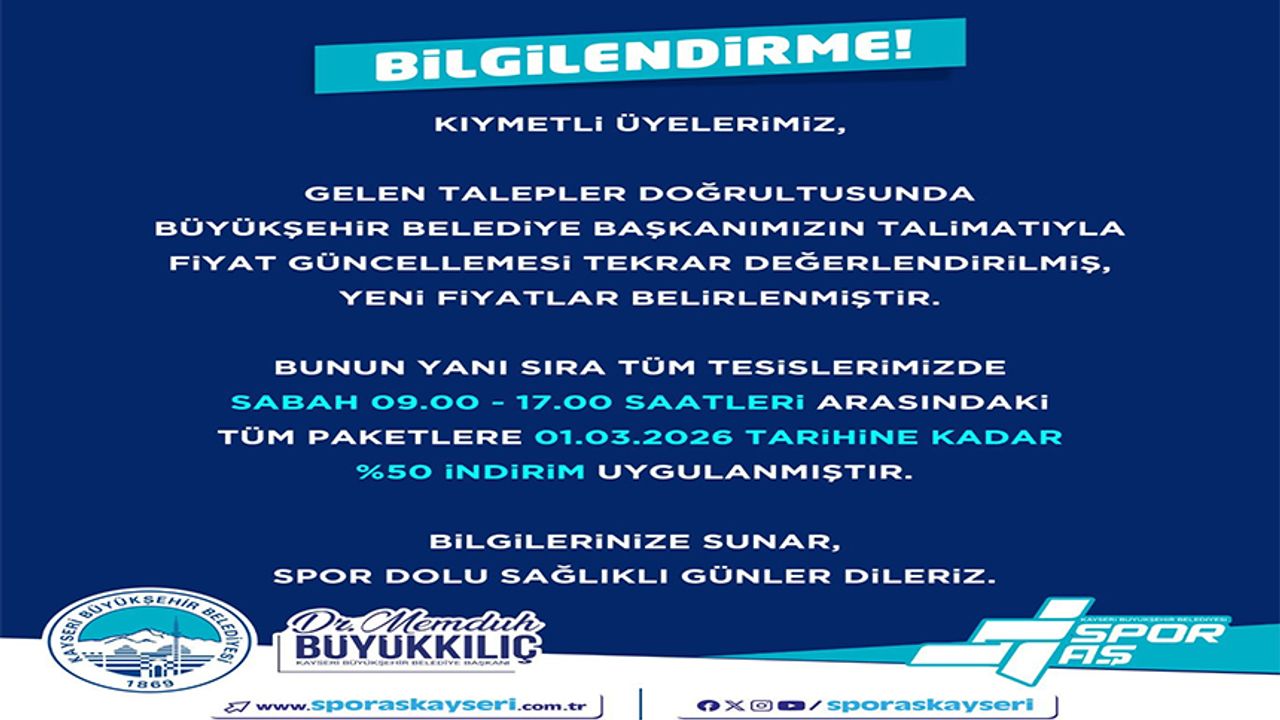 Kayseri Büyükşehir Belediyesi Spor A.Ş.’ye bağlı tesislerde fiyatlara zam uygulanmıştı. Gelen tepkiler üzerine fiyatlarda güncelleme yapıldı. Yapılan açıklamada, “Gelen talepler doğrultusunda Büyükşehir Belediye Başkanımızın talimatıyla fiyat güncellemesi yeniden değerlendirilmiş, yeni fiyatlar belirlenmiştir. Bunun yanı sıra tüm tesislerimizde sabah 09.00 – 17.00 saatleri arasındaki tüm paketlere 01.03.2026 tarihine kadar %50 indirim uygulanmıştır” ifadelerine yer verildi.
