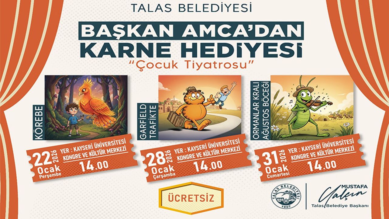 Talas Belediyesi, yarıyıl tatiline giren çocuklar için karne hediyesi olarak çocuk tiyatrosu etkinliği düzenliyor. “Başkan amcadan karne hediyesi” adıyla hazırlanan program kapsamında, sevilen çocuk oyunları minik izleyicilerle ücretsiz olarak buluşacak.