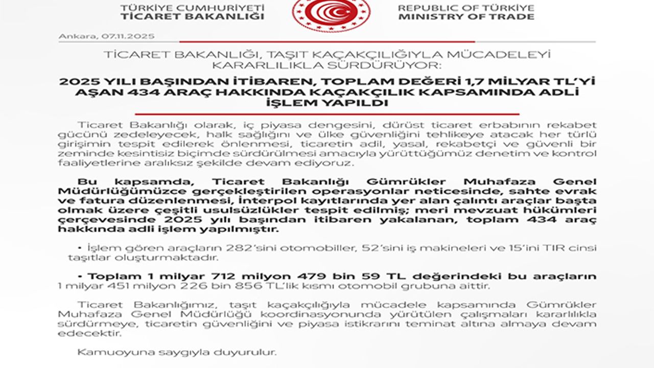 Ticaret Bakanlığı tarafından taşıt kaçakçılığı ile ilgili çalışmalar sürüyor. Bu kapsamda 2025 yılı başından itibaren, toplam değeri 1,7 Milyar lirayı aşan 434 Araç hakkında kaçakçılık kapsamında adli işlem yapıldı.