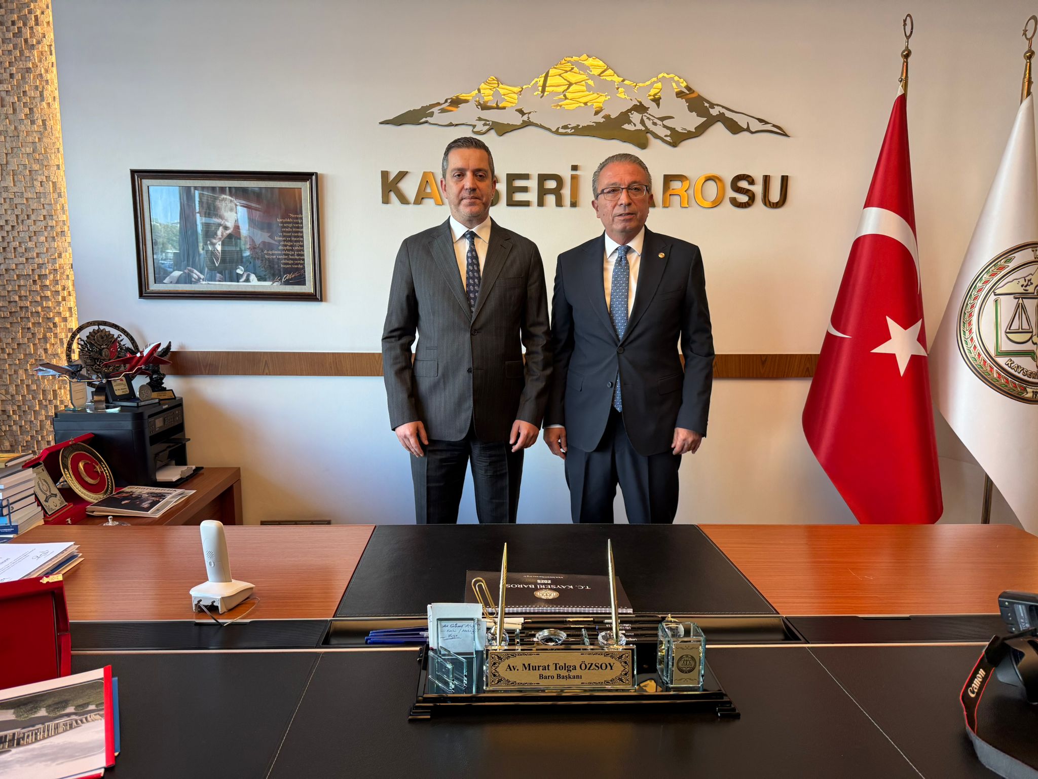 Türkiye Barolar Birliği Başkanı Erinç Sağkan, bir dizi ziyaret için geldiği Kayseri’de ilk olarak Kayseri Barosu’nu ziyaret ederek, Baro Başkanı Murat Tolga Özsoy ve yönetimini ziyaret etti. Ziyarette basın mensuplarına açıklamalarda bulunan Özsoy, Kayseri Barosu’na 7 bin 320 metrekareye yakın bir sosyal tesis alanı kazandırdıklarını Sağkan’ın da bu nedenle Kayseri’ye geldiğini belirterek, “Kıymetli başkanım bugün Kayseri Baromuzda misafir ediyoruz. Gelme sebebi öncelikle Kayseri Barosuna yakın zamanda sosyal medyada ve basında görmüşsünüzdür. 7 bin 320 metreye kareye yakın bir sosyal tesis alanı kazandırmıştık. Bunun ön izinleri halloldu. Türkiye Barolar Birliğimize ilgili yerimiz tahsis oldu. Bundan sonra mimari proje ve diğer yerel yönetimlere ilişkin işlemler başlayacak. Bu konuda da başkanıma kıymetli başkanım Erinç Sağkan ve Türkiye Barolar Birliği Yönetim Kurulu üyelerimize Kayseri Barosu adına çok teşekkür ediyorum. Şahsım adına teşekkür ediyorum. Kayseri güzel bir projeye hazırlanıyor. Güzel bir projemiz başlıyor.” dedi.