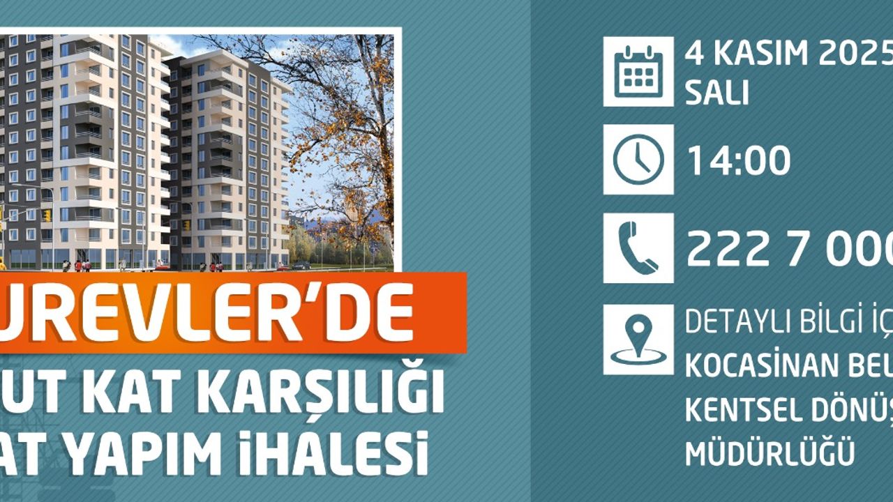 Öte yandan Kocasinan Belediyesi’nin kentsel dönüşüm projeleri kapsamında Uğurevler Mahallesi’nde 4 Kasım Salı günü saat 14.00’te kat karşılığı ihalesi gerçekleştirilecek. Kat karşılığı ihalenin şartname ve eklerinin Kentsel Dönüşüm Müdürlüğü’nden temin edilebileceği gibi, 0 (352) 222 70 00 numaralı telefondan da ayrıntılı bilgi alınabileceği kaydedildi.