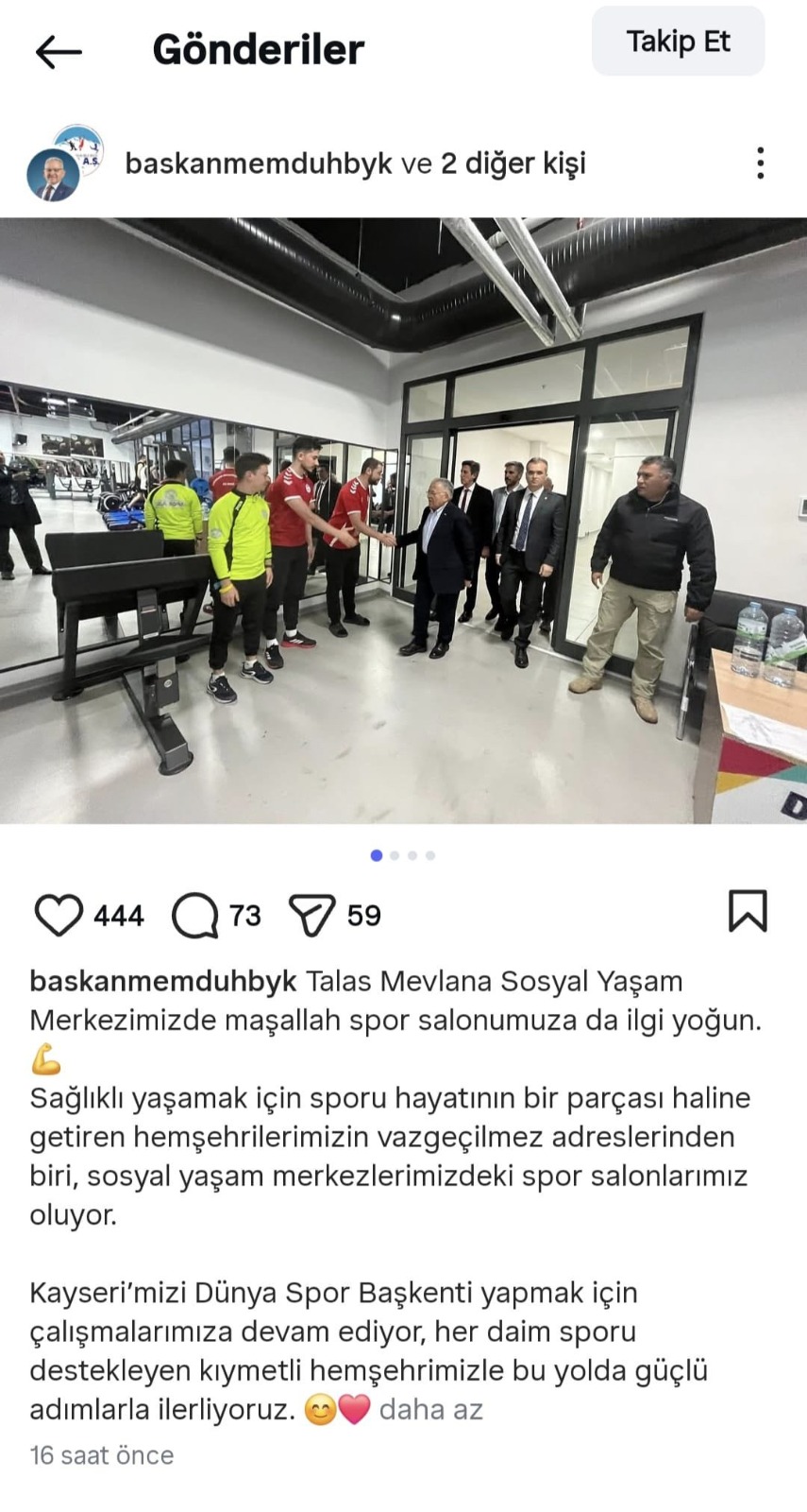 Kayseri Büyükşehir Belediye Başkanı Memduh Büyükkılıç da Talas Mevlana Sosyal Yaşam Merkezi’ne dün bir ziyaret gerçekleştirdi ve sosyal medya üzerinden de yapmış olduğu paylaşımda “Spor salonumuza ilgi yoğun. Kayserimizi dünya spor başkenti yapmak için çalışmalarımıza devam ediyor, her daim sporu destekleyen kıymetli hemşehrimizle bu yolda güçlü adımlarla ilerliyoruz” ifadelerine yer vermişti.