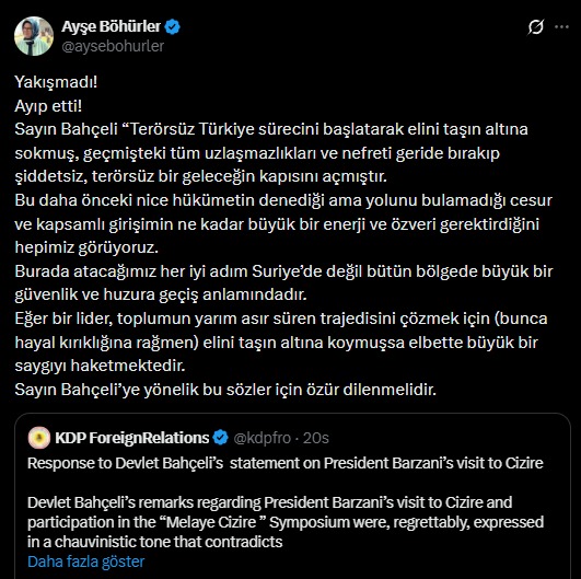 Irak KDP lideri Mesud Barzani'nin Cizre ziyareti sonrası ortaya çıkan görüntülere tepki gösteren MHP Genel Başkanı Devlet Bahçeli’ye yönelik açıklama yapan KDP’ye, AK Parti Kayseri Milletvekili Ayşe Böhürler, “Sayın Bahçeli’ye yönelik bu sözler için özür dilenmelidir” dedi.