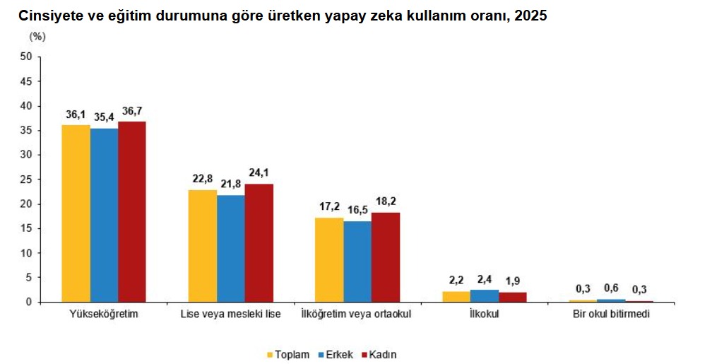 Türkiye İstatistik Kurumu (TÜİK), ilk kez yapay zeka istatistiklerini açıkladı. Buna göre Türkiye'de Üretken yapay zeka kullandığını beyan eden bireylerin oranı 2025 yılında yüzde 19,2 olurken bireylerin eğitim durumu incelendiğinde yapay zeka kullanma oranının en fazla yüzde 36,1 ile yükseköğretim mezunlarında olduğu belirlendi.