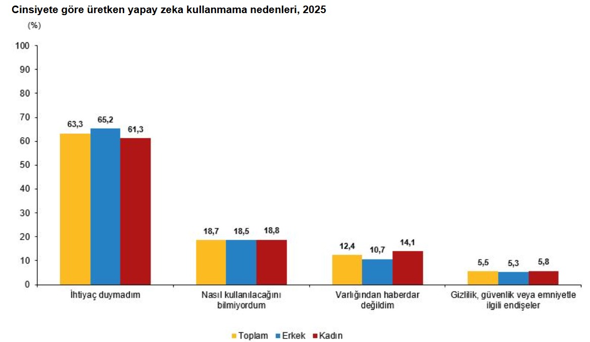 Yapay zeka kullanan bireyler eğitim durumuna göre incelendiğinde; 2025 yılında yapay zeka kullanma oranının en fazla yüzde 36,1 ile yükseköğretim mezunlarında olduğu belirlendi. Bunu, yüzde 22,8 ile lise veya mesleki lise mezunu, yüzde 17,2 ile ilköğretim veya ortaokul mezunu, yüzde 2,2 ilkokul mezunu bireyler takip etti. Bu oran cinsiyete göre incelendiğinde ise, ilkokul mezunları ve bir okul bitirmeyenler arasında erkeklerin kadınlara göre daha yüksek oranda yapay zeka kullandığı, ilköğretim veya ortaokul, lise veya mesleki lise ile yükseköğretim mezunlarında kadınların kullanım oranının erkeklerin üzerinde olduğu görüldü. Öte yandan yapay zeka kullanmadığını beyan eden bireylerin kullanmama nedenleri incelendiğinde; en yüksek oranın yüzde 63,3 ile yapay zekaya ihtiyaç duymama gerekçesinin olduğu görüldü. Bunu, yüzde 18,7 ile yapay zekanın nasıl kullanılacağını bilmemek, yüzde 12,4 ile yapay zekanın varlığından haberdar olmamak ve yüzde 5,5 ile gizlilik, güvenlik veya emniyetle ile ilgili endişeleri izledi.